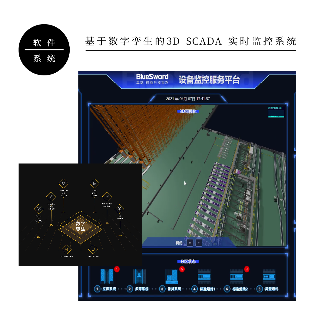 蘭劍智能數(shù)字孿生系統(tǒng)(BlueSword Digital Twins)是一款集動態(tài)建模、虛擬仿真、離線調(diào)試、3D監(jiān)控、智能優(yōu)化于一體的全流程物流平臺。