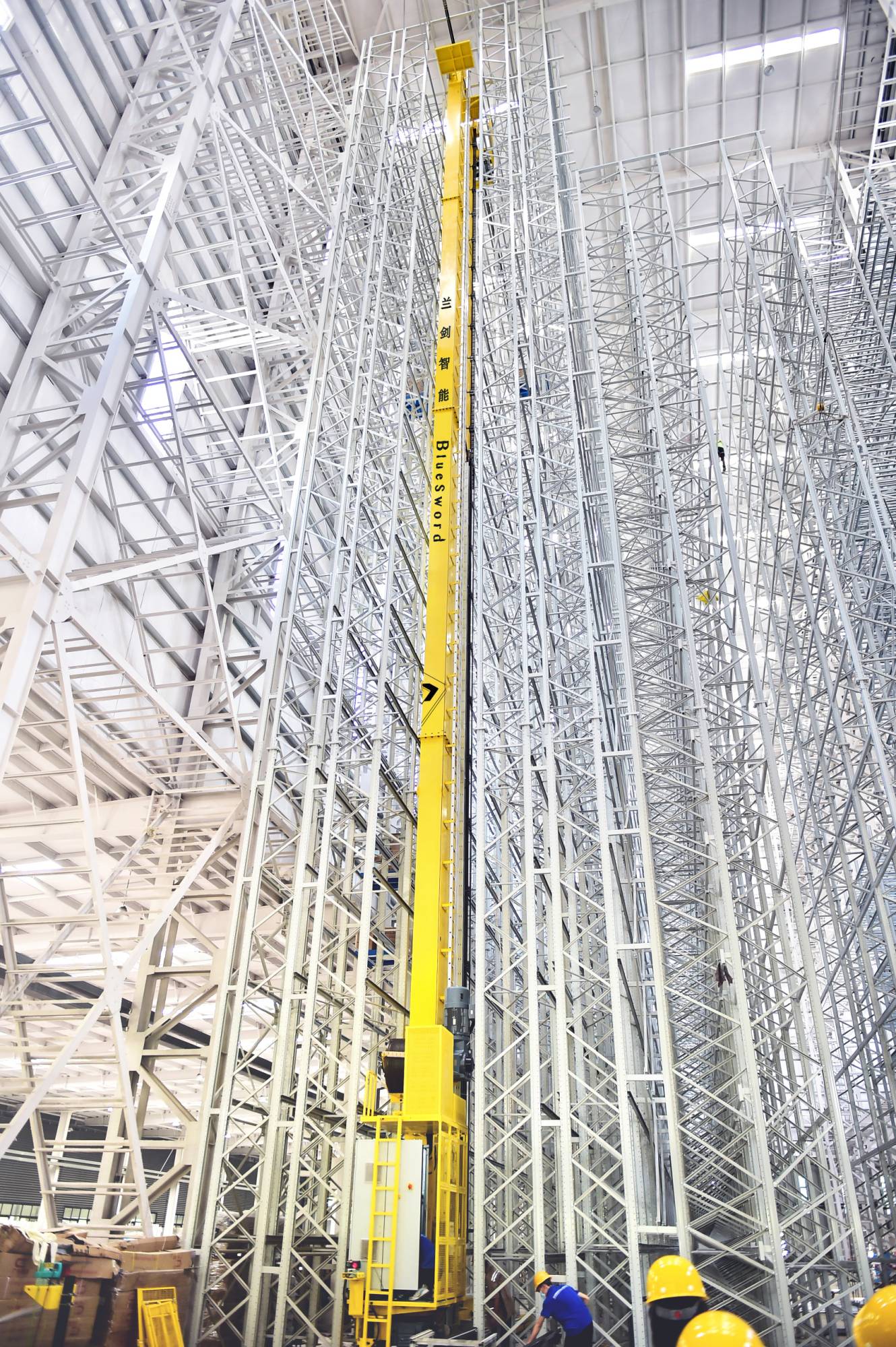 如果說(shuō)抽象的數(shù)字難以形象地理解其高度之高,舉幾個(gè)例子讓你遙遙遐想一下。假定住房層高3米(一般不到3米),堆垛機(jī)智能倉(cāng)的高度就相當(dāng)于有15層的小高樓房;比濟(jì)南地標(biāo)——泉標(biāo)(高38.11米),還要高上幾米;在現(xiàn)場(chǎng)仰頭看堆垛機(jī)上橫梁,需要用手扶著工程帽,因?yàn)椴恢雇豕跁?huì)掉,帽子也會(huì)掉,令人不得不贊嘆仰之彌高!