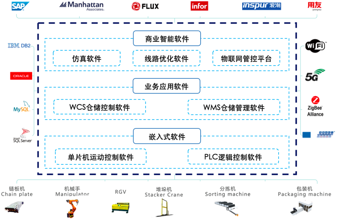 蘭劍的智能化軟件系統(tǒng)具有豐富的集成經(jīng)驗,能夠與 SAP、浪潮 ERP、用友 ERP 等國內(nèi)外知名 ERP 系統(tǒng),與DB2、Oracle、MySQL、SQL Server 等各類數(shù)據(jù)庫,與Wi-Fi、5G、ProfiBus 等不同通訊方式,與堆垛機、穿梭車、AGV、輸送線、分揀機、包裝機、機械手等自動化物流設(shè)備進行高效、順暢的集成、對接。